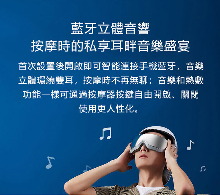 藍牙立體音響,按摩、熱敷、內置舒緩音樂同時進行,按摩時的私享耳畔音樂,按摩器按鍵自由開啟、關閉