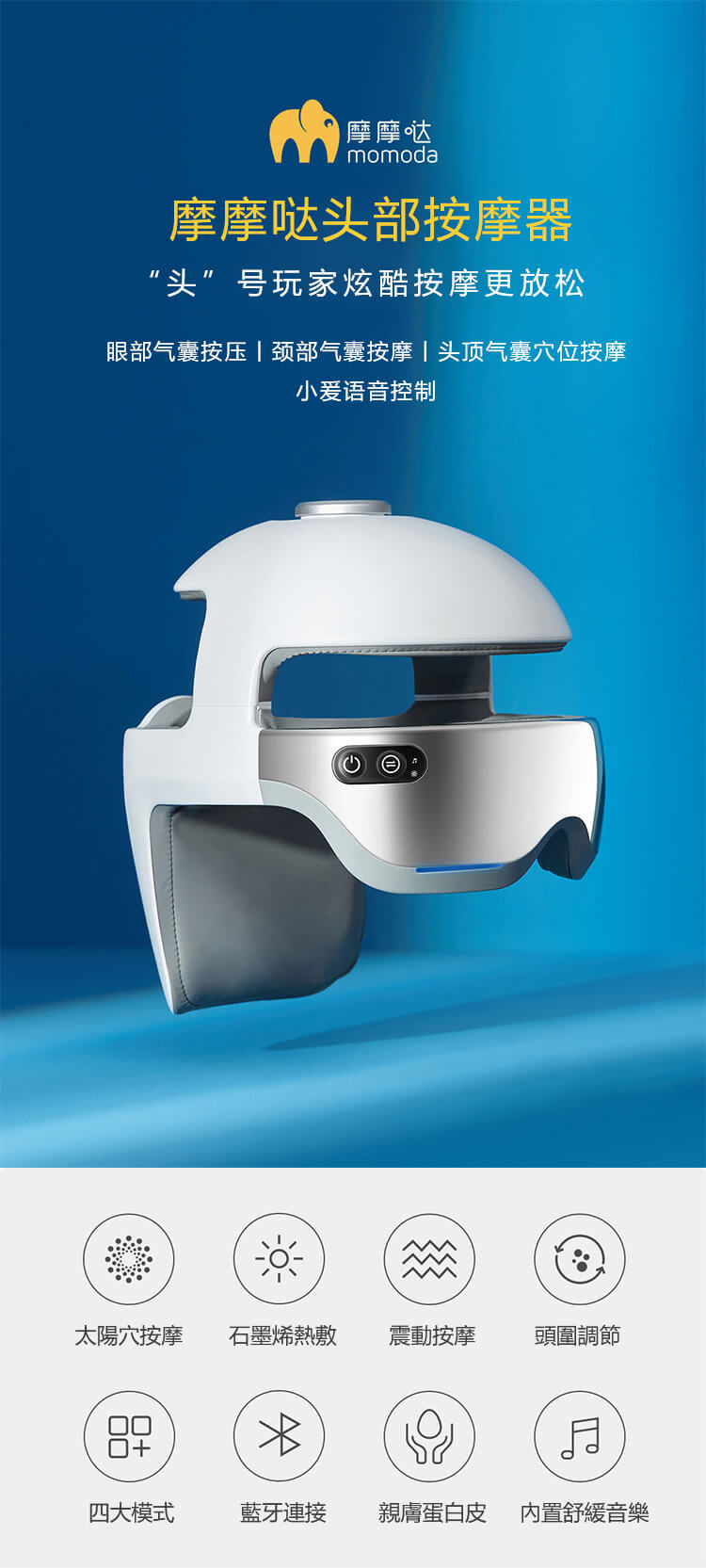 Momoda智能頭部按摩器採用3D氣囊環繞頭部、頸部和眼睛,為用戶帶來愉悅的多部位一站式按摩體驗