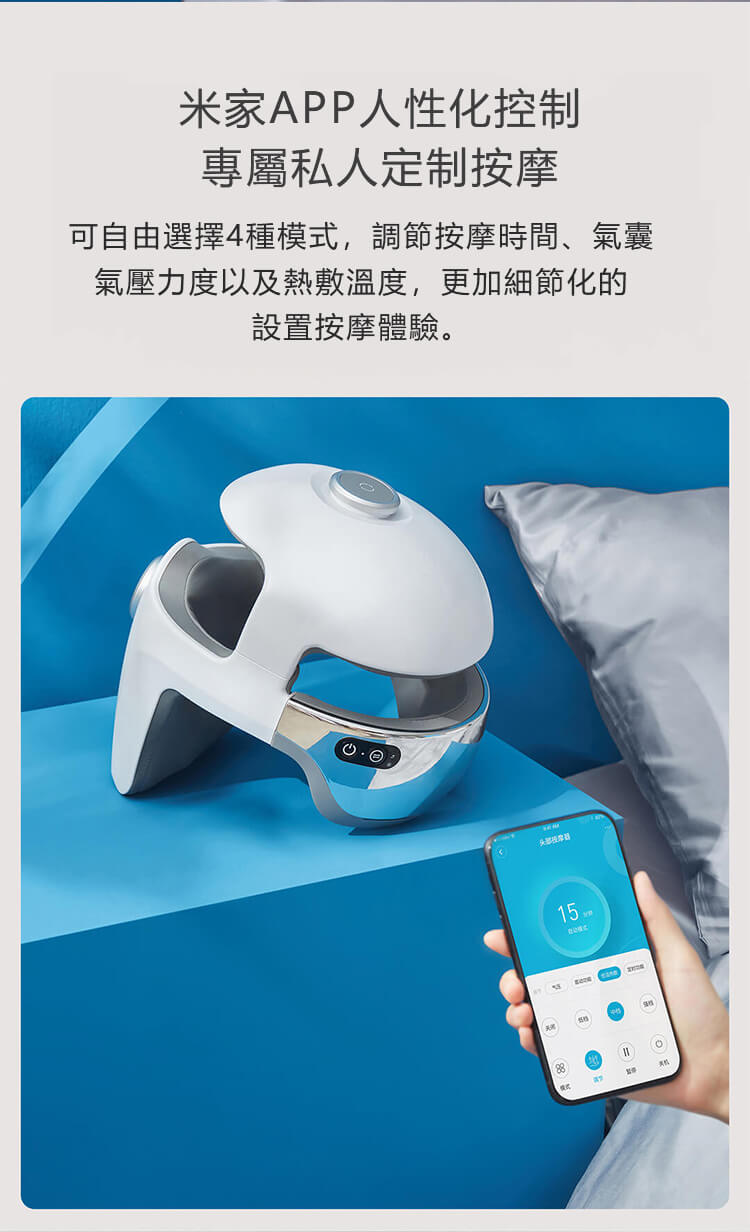 通過米家APP,您可以自由選擇4種模式,調節按摩時間、氣囊壓力、加熱溫度。