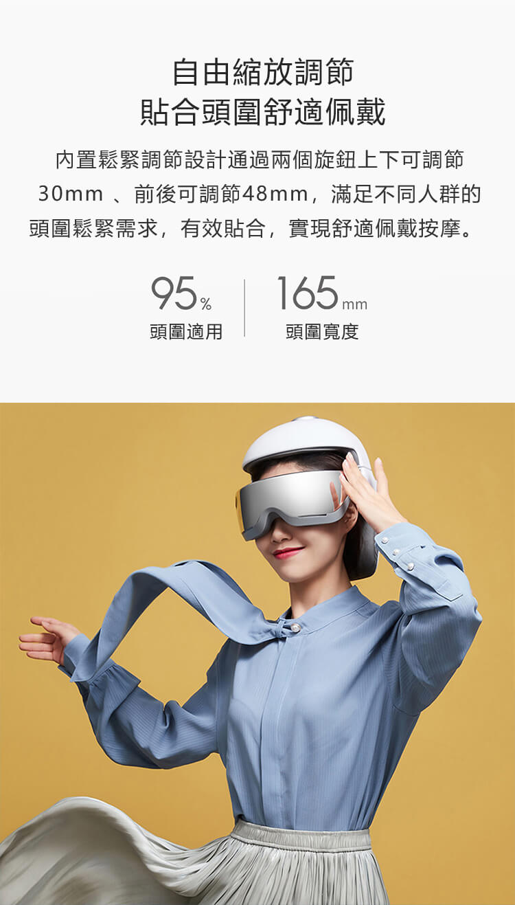 內置鬆緊調節設計通過兩個旋鈕上下可調節30mm 、前後可調節48mm,滿足不同人群的頭圍鬆緊需求,有效貼合,實現舒適佩戴按摩。