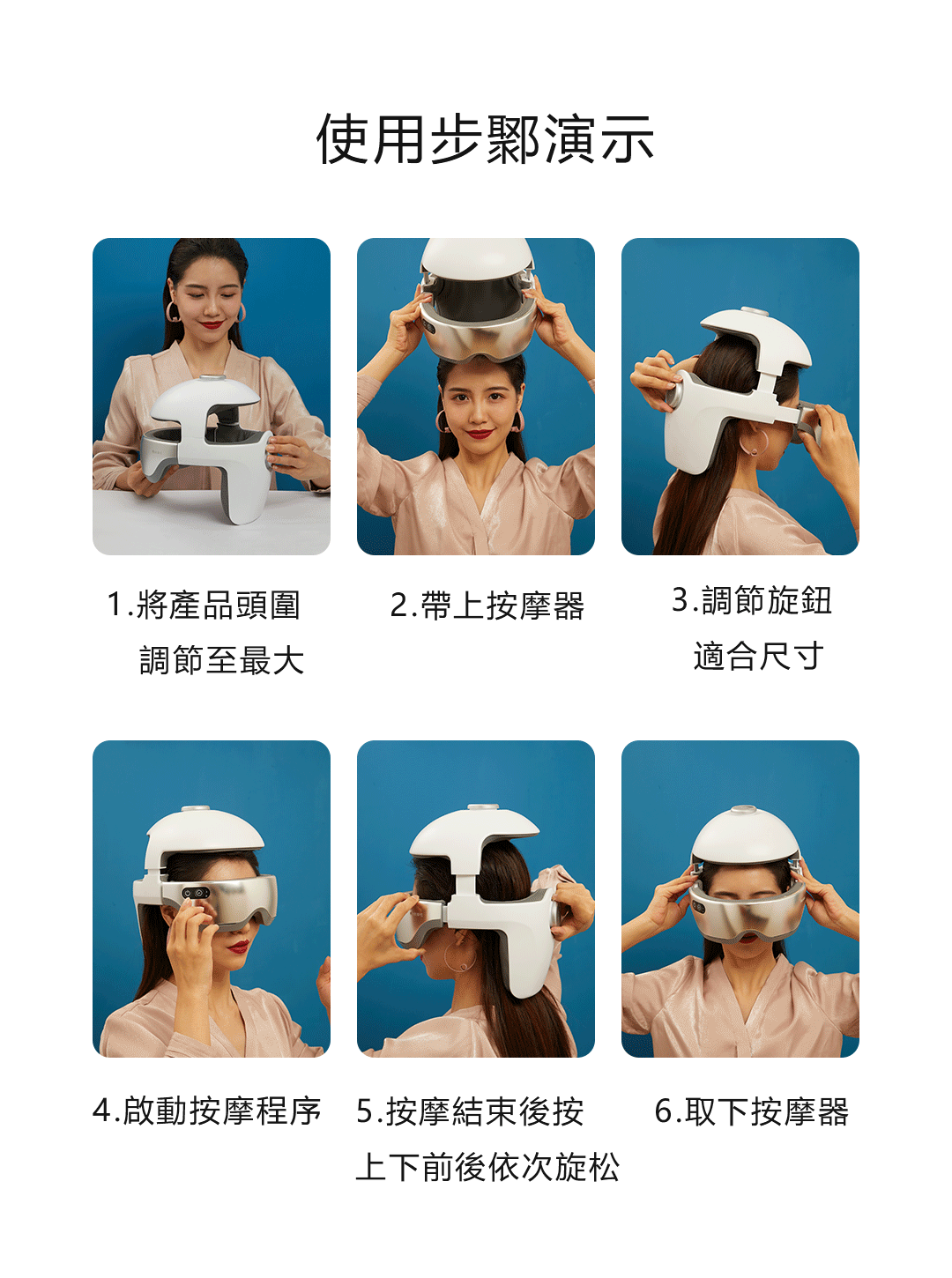 - 氣囊按摩—氣囊環抱頸部,捶打揉按,頭部按摩太陽穴交替按壓更符合體感舒適