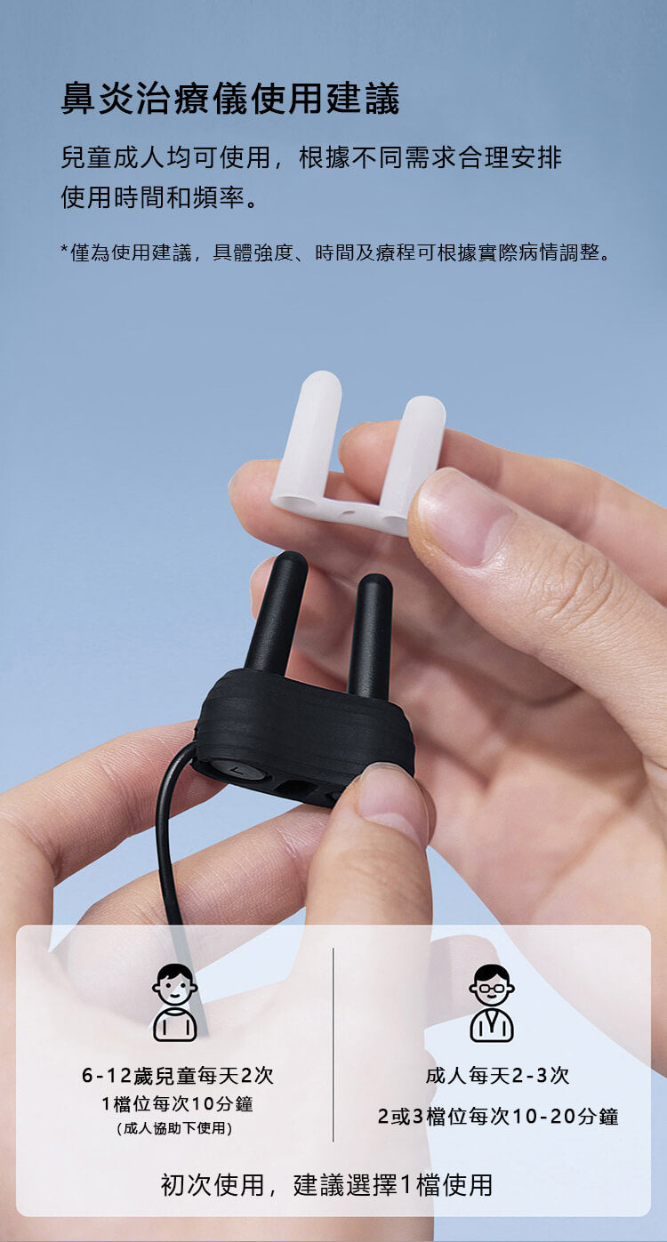 - 鼻炎治療儀—這是一個咽炎、鼻炎的輔助治療儀,不口服藥物、無痛無創、不傷鼻腔、對鼻塞、鼻癢、流涕、打噴嚏都有效果