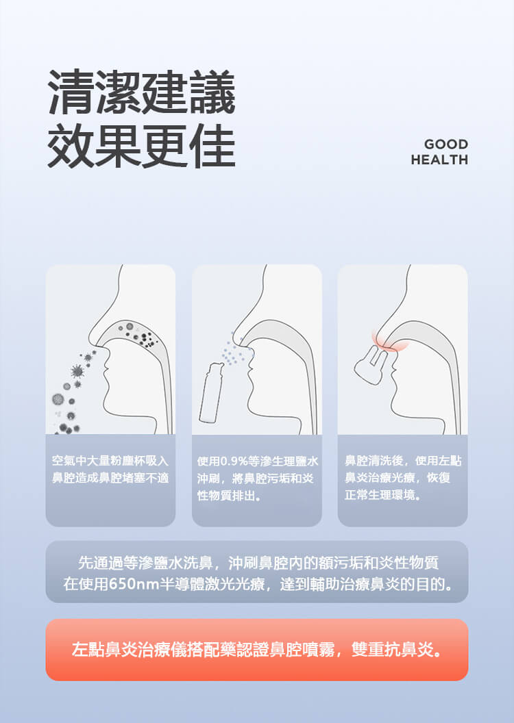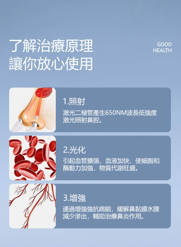 - 650nm光療—採用650納米的弱激光光照射鼻腔,血管擴張,流血加快,使細胞和酶動力強,起到緩解鼻粘膜水腫,增強抗病能力