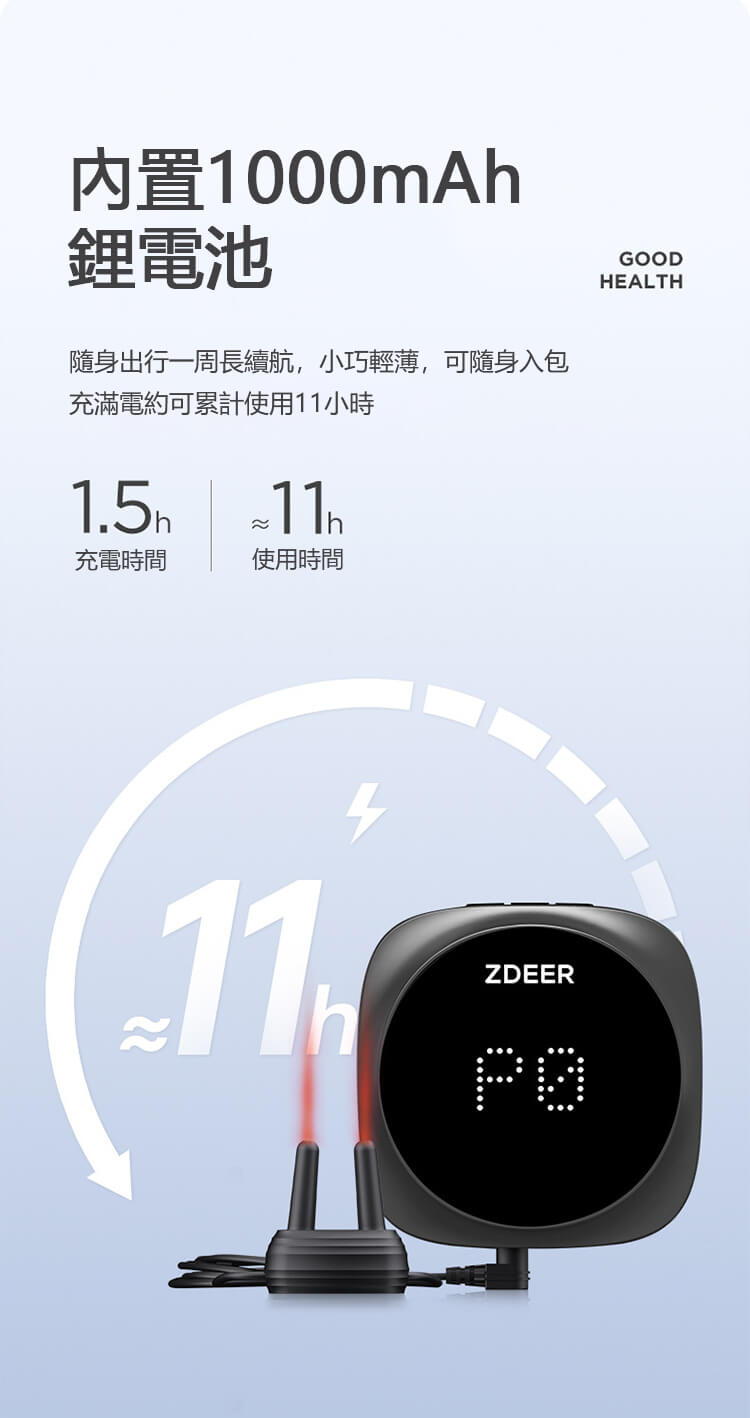 內置 1000mAh 鋰電池,只需 1.5 小時便可充滿,而充滿電可使用近 11 小時。