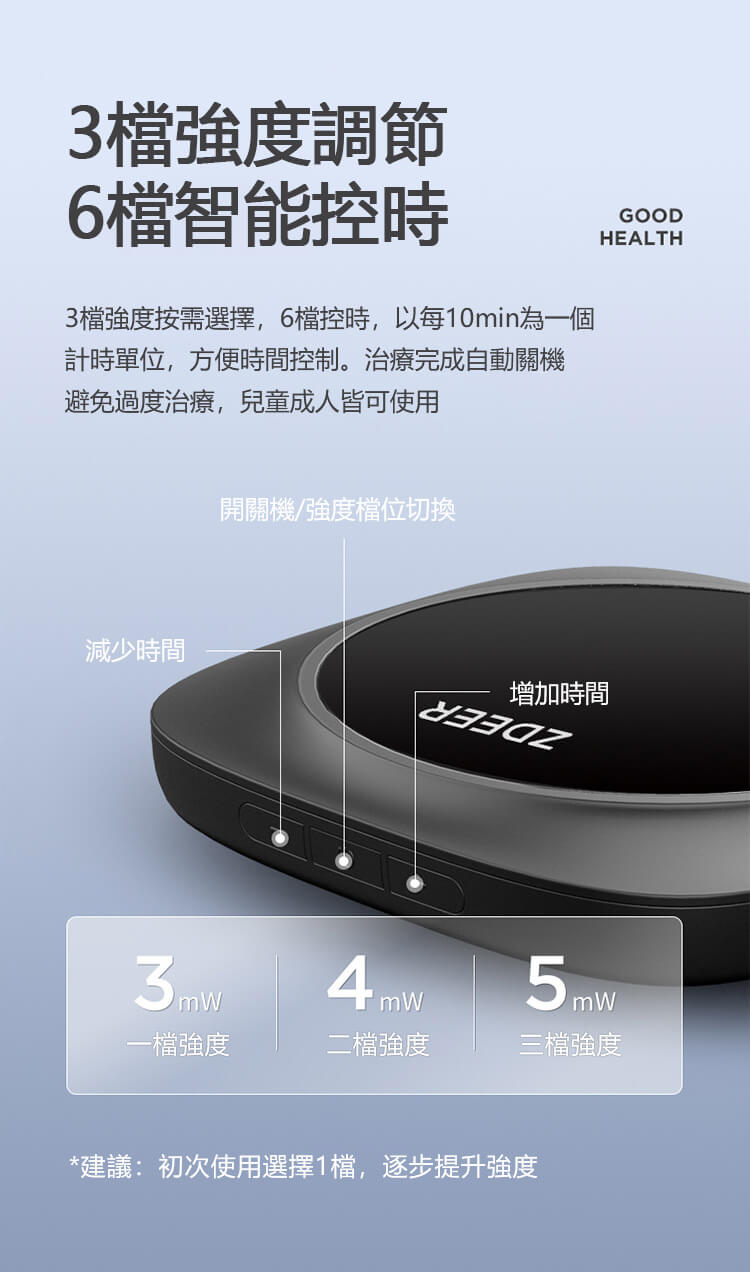 3檔強度按需選擇,6檔控時,以每10min為一個計時單位,方便時間控制。治療完成自動關機,避免過度治療,兒童成人皆可使用