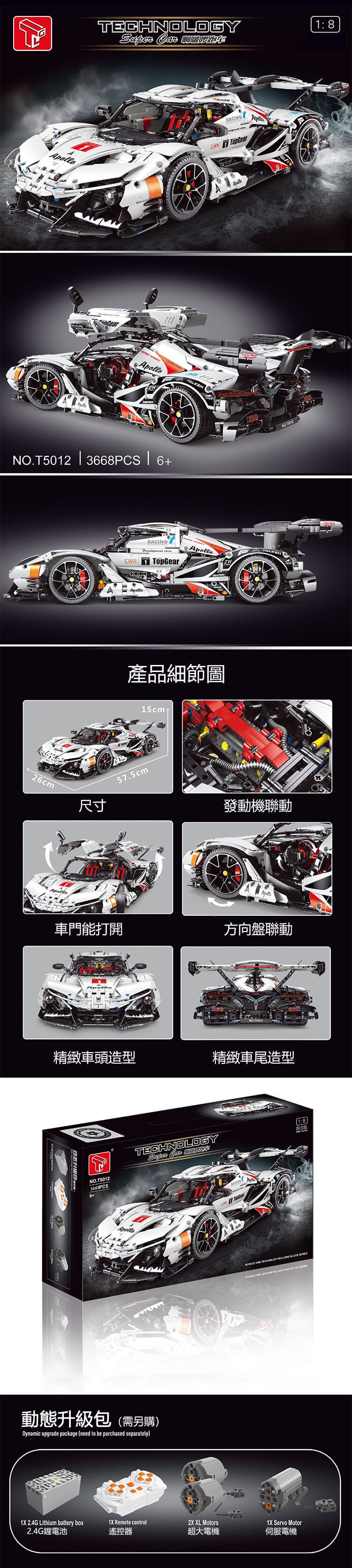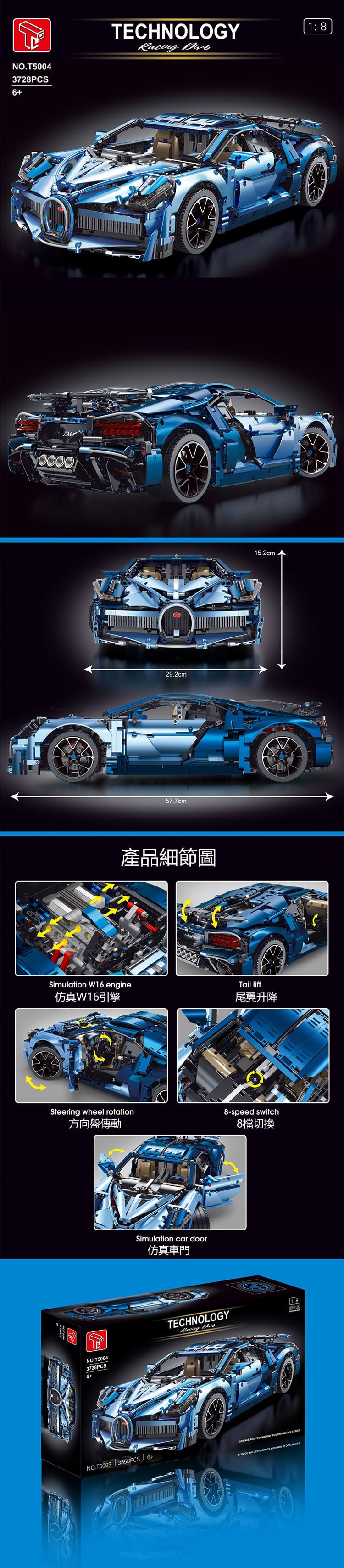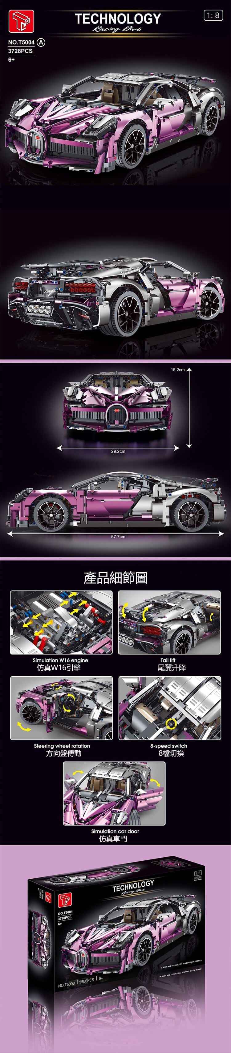 還原度高,車輛變速箱部門完全採用了輪轂的設計;帥氣的尾翼,精美內飾,掛檔清晰,這是一個非常棒的積木跑車
