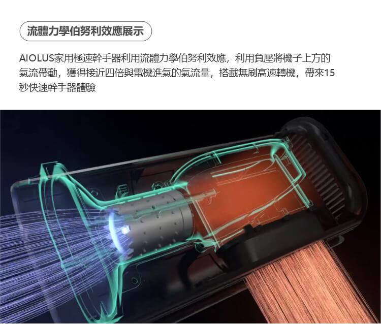 AIOLUS家用極速幹手器利用流體力學伯努利效應,利用負壓將機子上方的 氣流帶動,獲得接近四倍與電機進氣的氣流量,搭載無刷高速轉機,帶來15 秒快速幹手器體驗