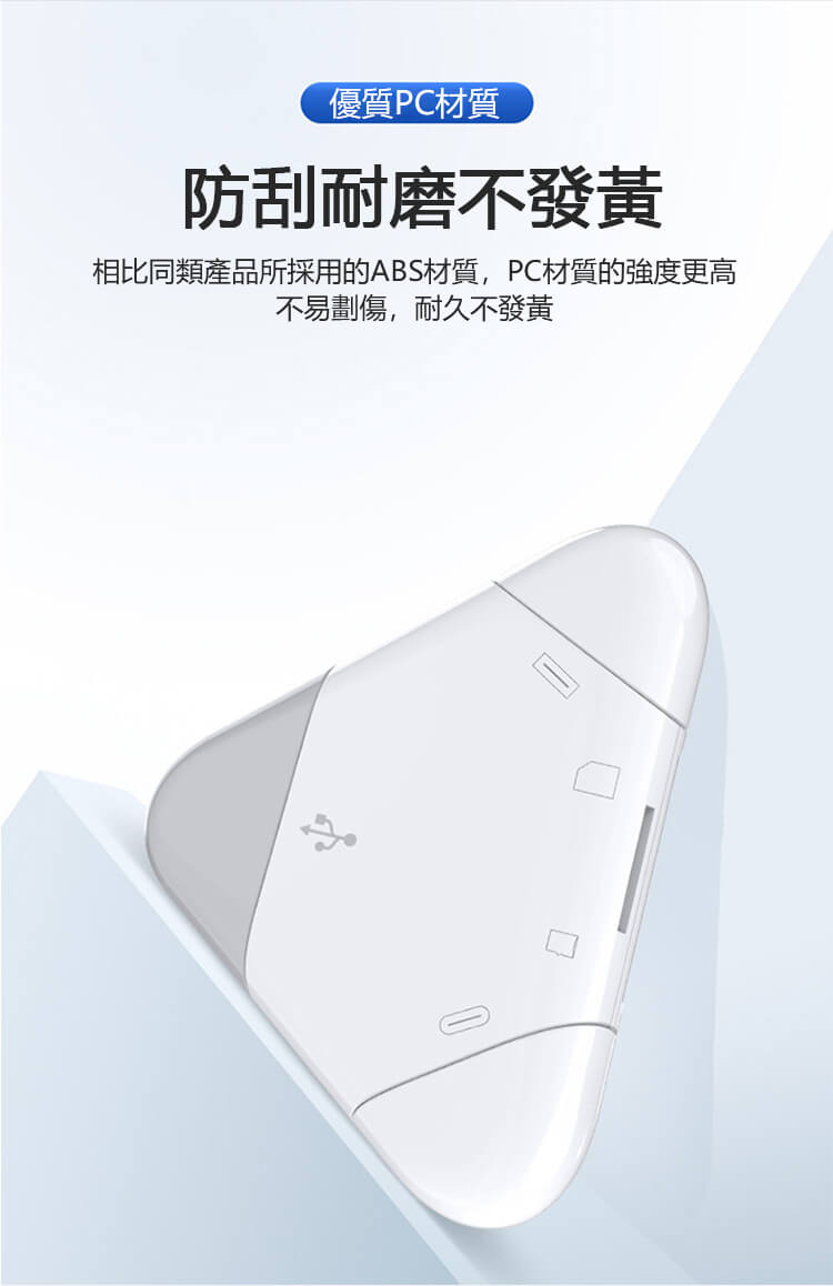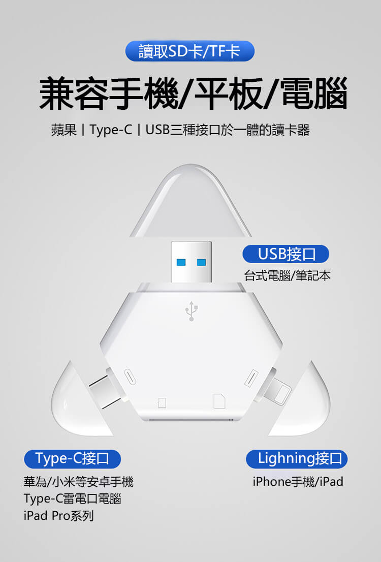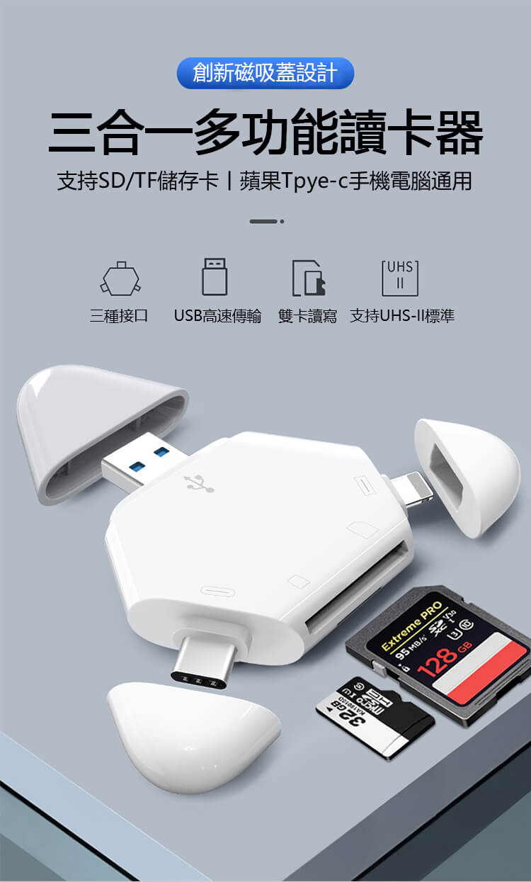 - 多功能—三合一多功能讀卡器,支持SD/TF儲存卡、蘋果Type-C手機電腦通用