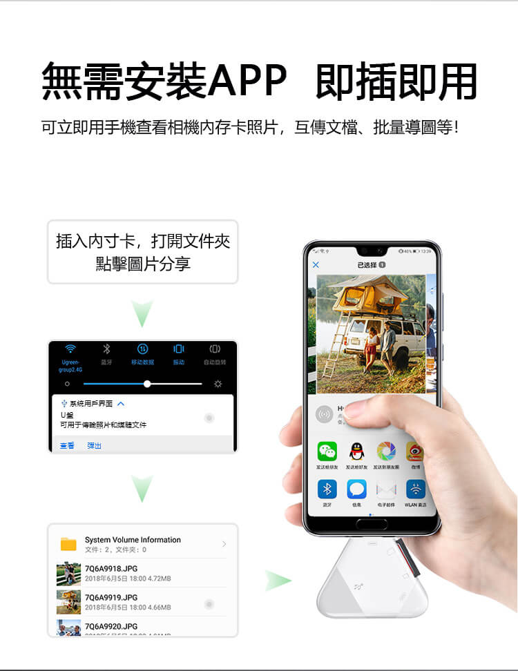 - 無需APP—不用安裝驅動,即插即用, 可立即查看相機內存卡照片,互傳文檔、批量導圖