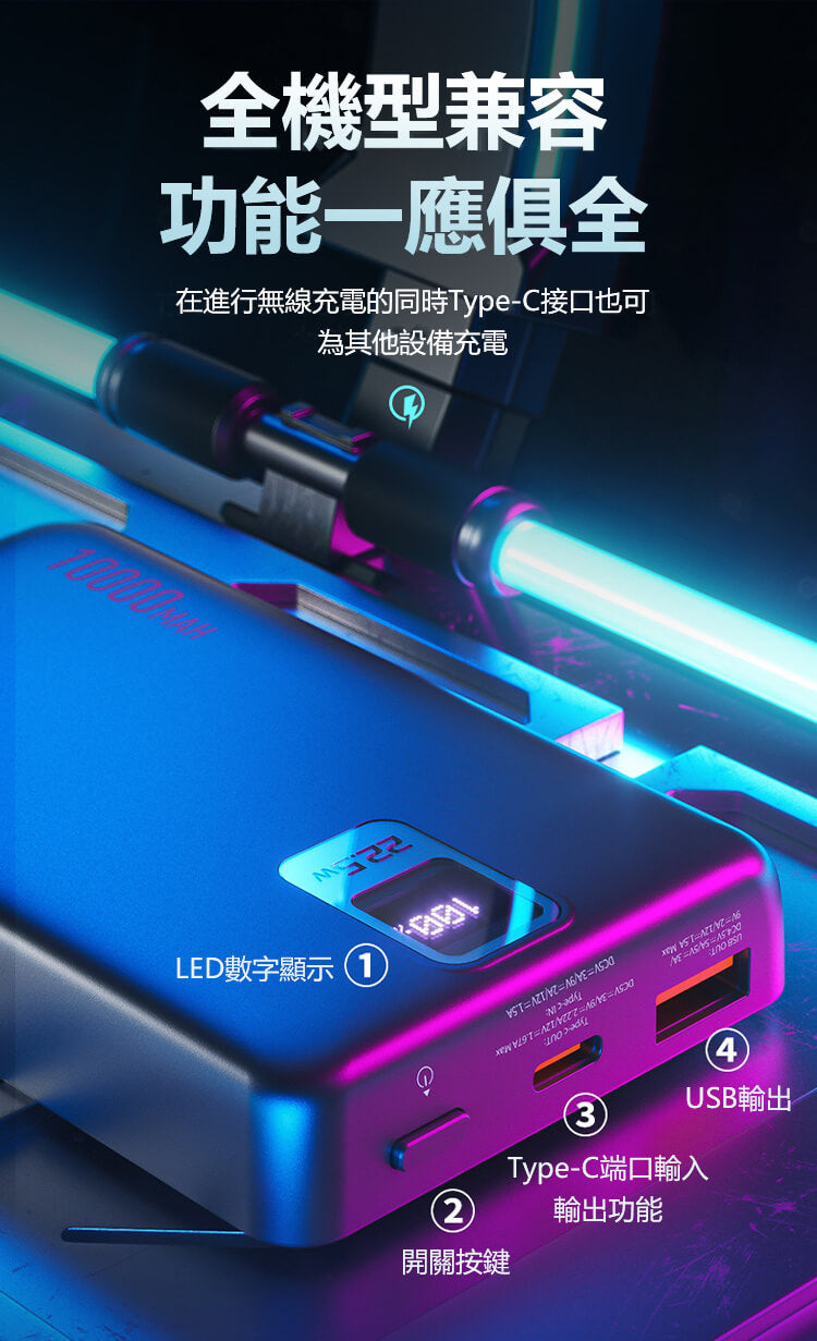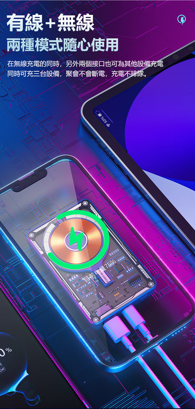 - 一線互充—雙模式快充(無線充 + USB-C充電) 可用同一條USB-C線供電及取電
