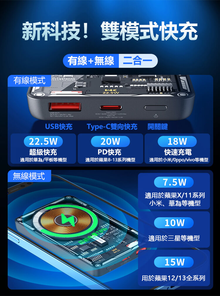 - 15W快充—支持15W無線、PD22.5W充電、兼容 5W/7.5W/10W Qi設備、支援PD3.0 20W快充