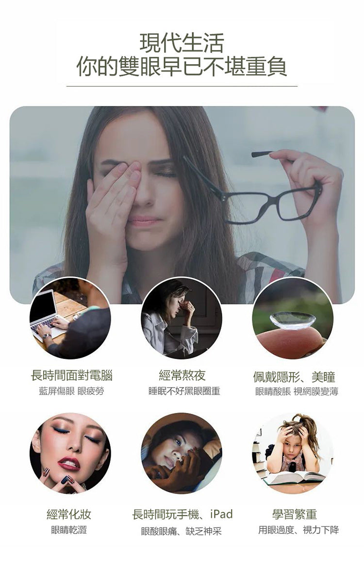 你是否長期的面對電腦、玩手機;導致過度用眼,眼乾、眼癢、眼澀、眼疲勞、眼灼痛!