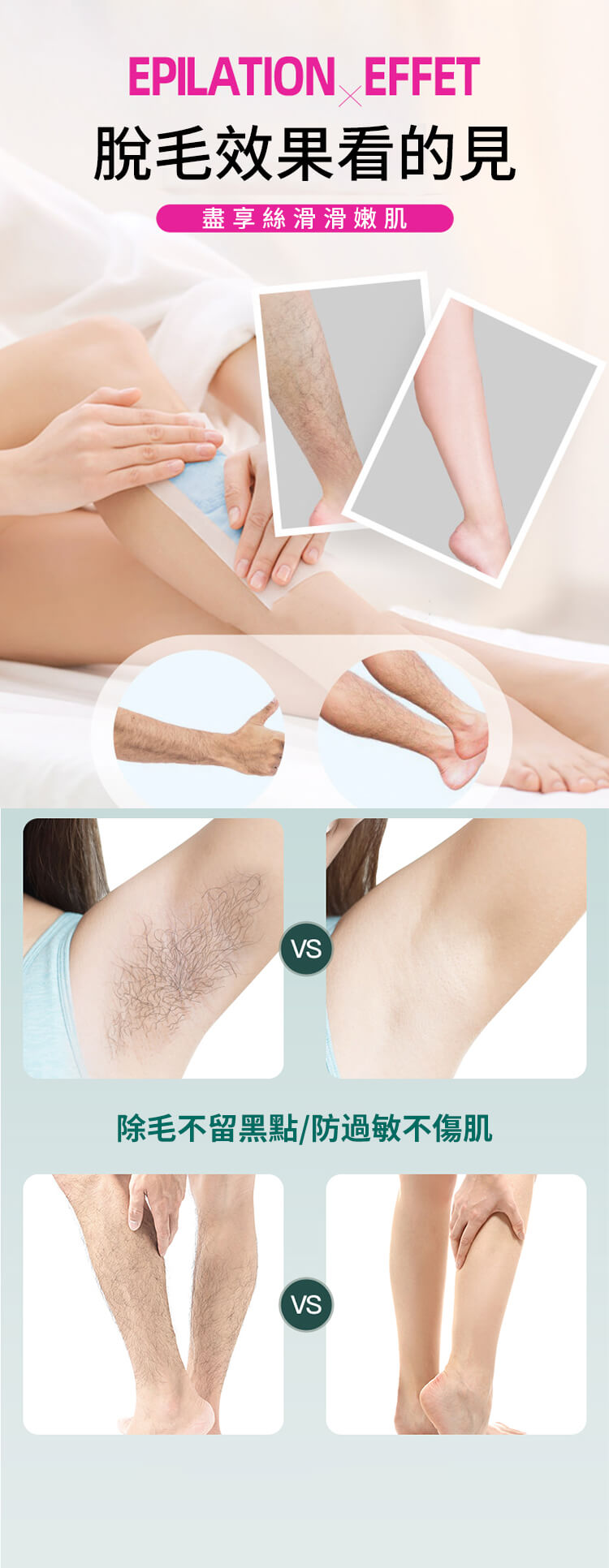 - 根部脫毛不留黑點—強粘性天然蠟將毛髮從根部拔除肌膚瞬間光潔