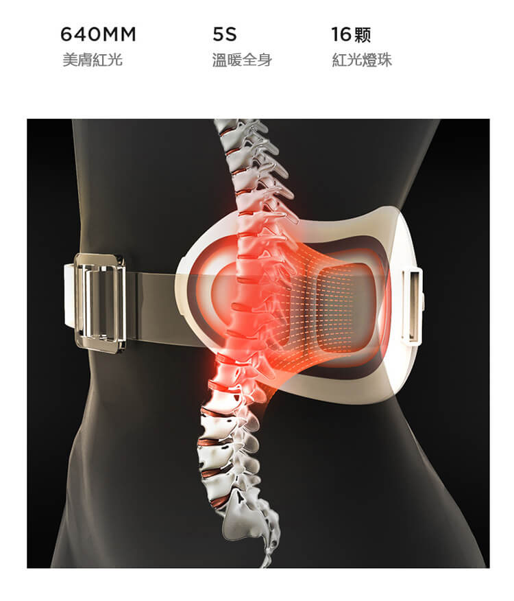 - 紅光修護技術—紅光修護技術不僅能有效緩解女性姨媽痛問題,同時也能促進血液循環,有效修復腰椎勞損,緩解腰間盤突出帶來的刺痛感。