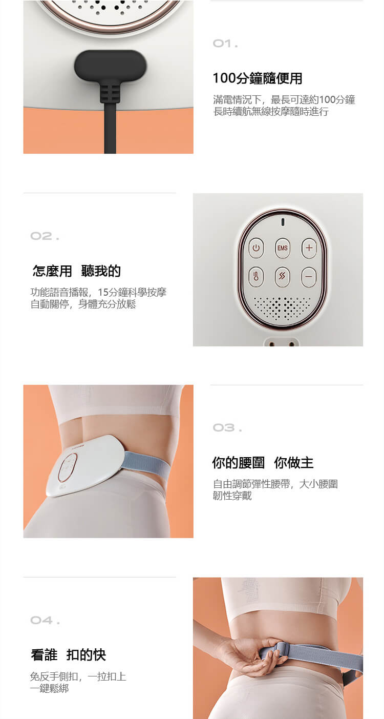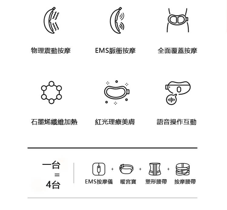 - 多功能—買1得4,EMS按摩儀+暖宮寶+塑形腰帶+按摩腰帶四合一的暖宮腰帶