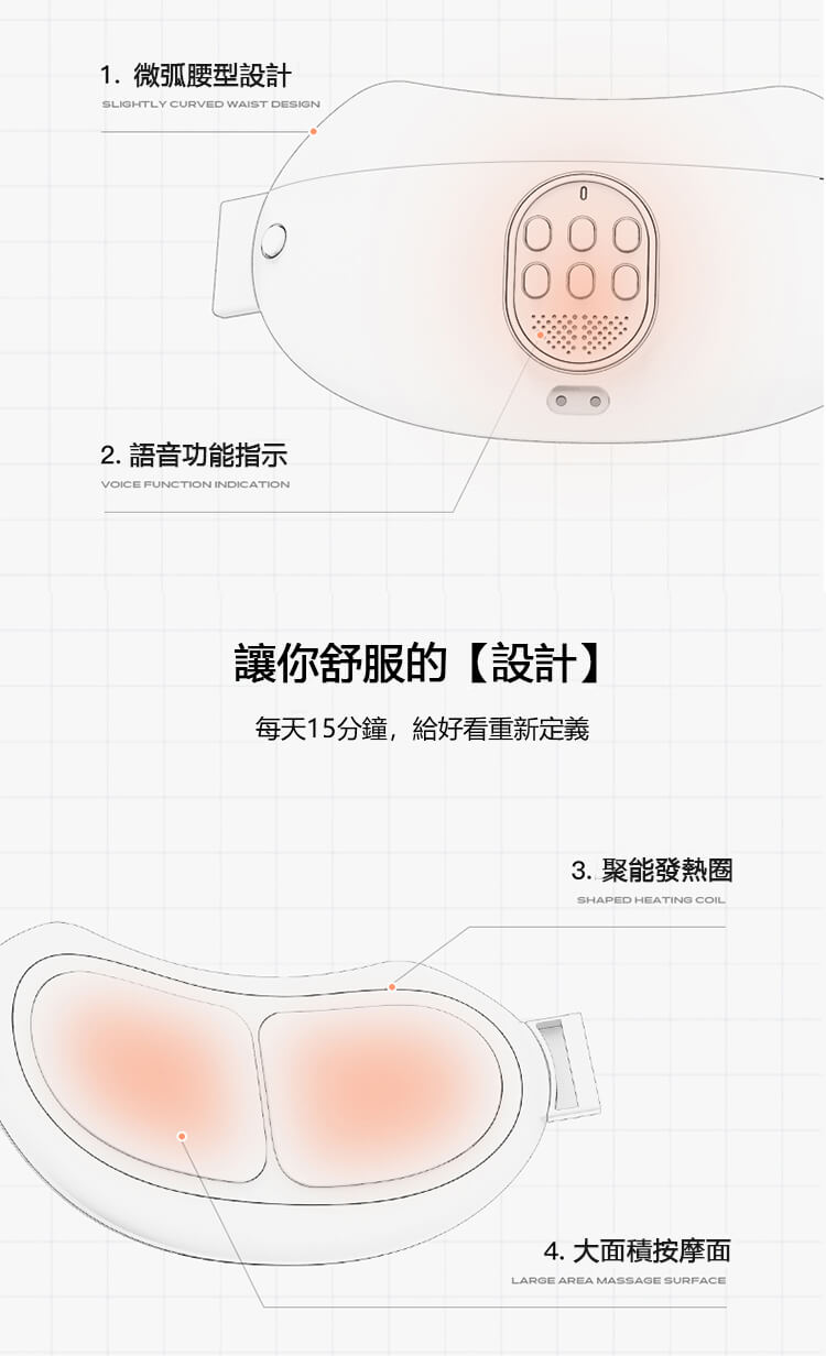 - 物理震動按摩—配合變頻雙脈衝按摩,對腰腹進行震動按摩,深層按摩腹直肌、腹橫肌、腰椎等位置,有效增加腰腹彈性助力塑形