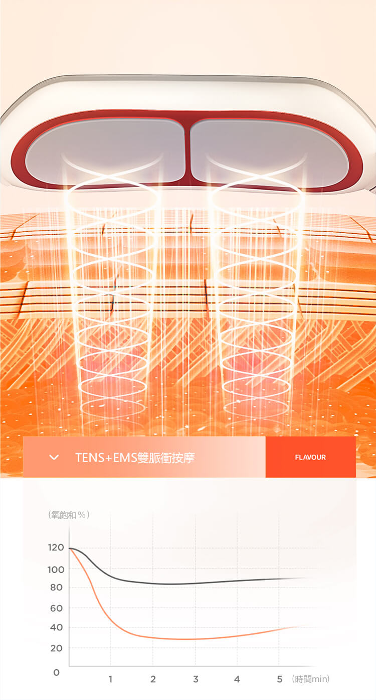 TENS脈衝能有效阻斷痛覺神經信號,同時搭配EMS脈衝為您帶來神經層,血管層、肌肉層,三層深度按摩體驗