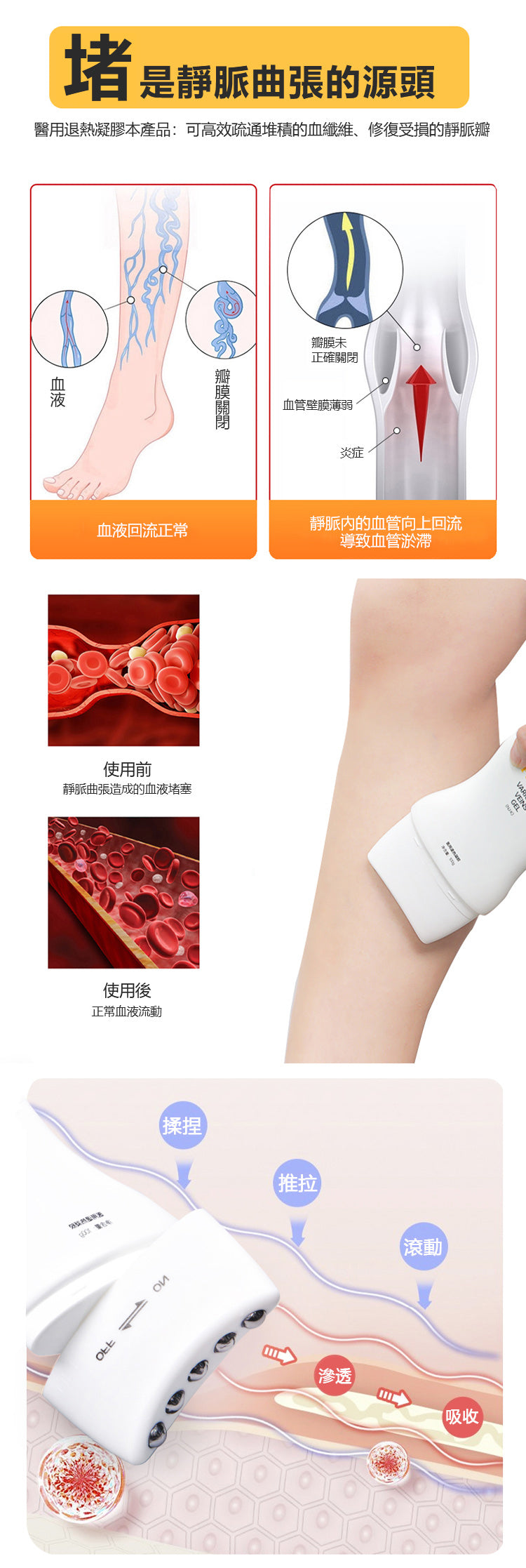 • 產品功效—化瘀通脈改善靜脈曲張,青筋凸起、蚯蚓血管、酸脹疼痛、舒緩針刺感,緩解麻木灼熱
