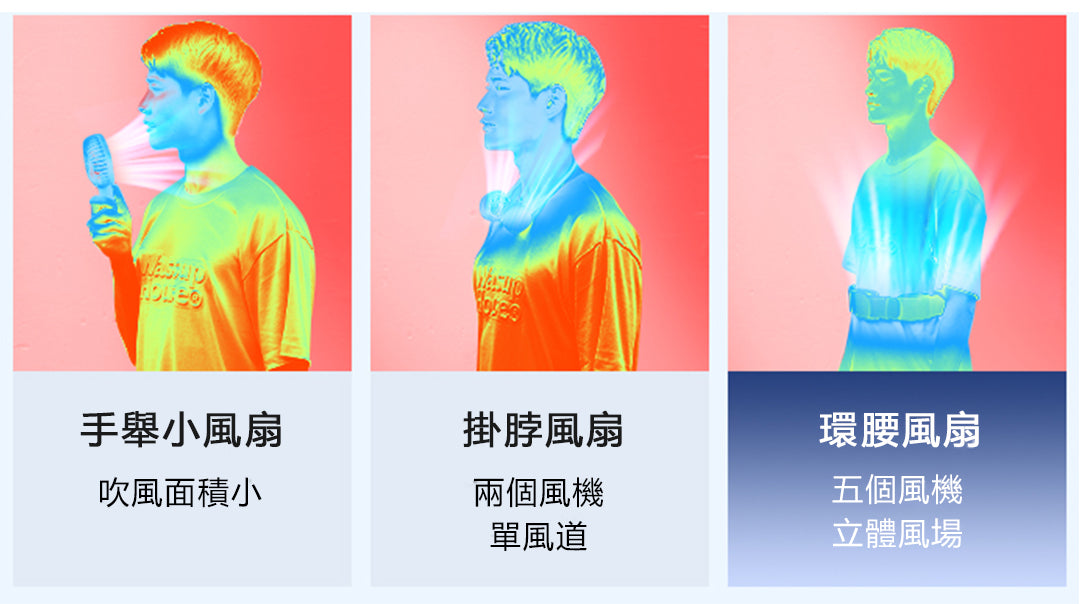 而AIOLUS掛腰風扇便攜式環腰小風扇,5部風機,360°全身急速降熱!