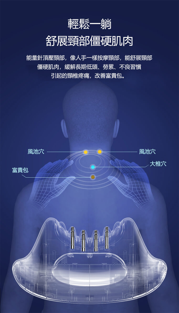 能量針頂壓頸部,像人手一樣按摩頸部,能舒展頸部 僵硬肌肉,緩解長期低頭、勞累、不良習慣 引起的頸椎疼痛,改善富貴包。