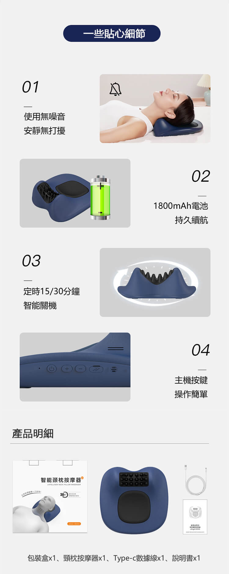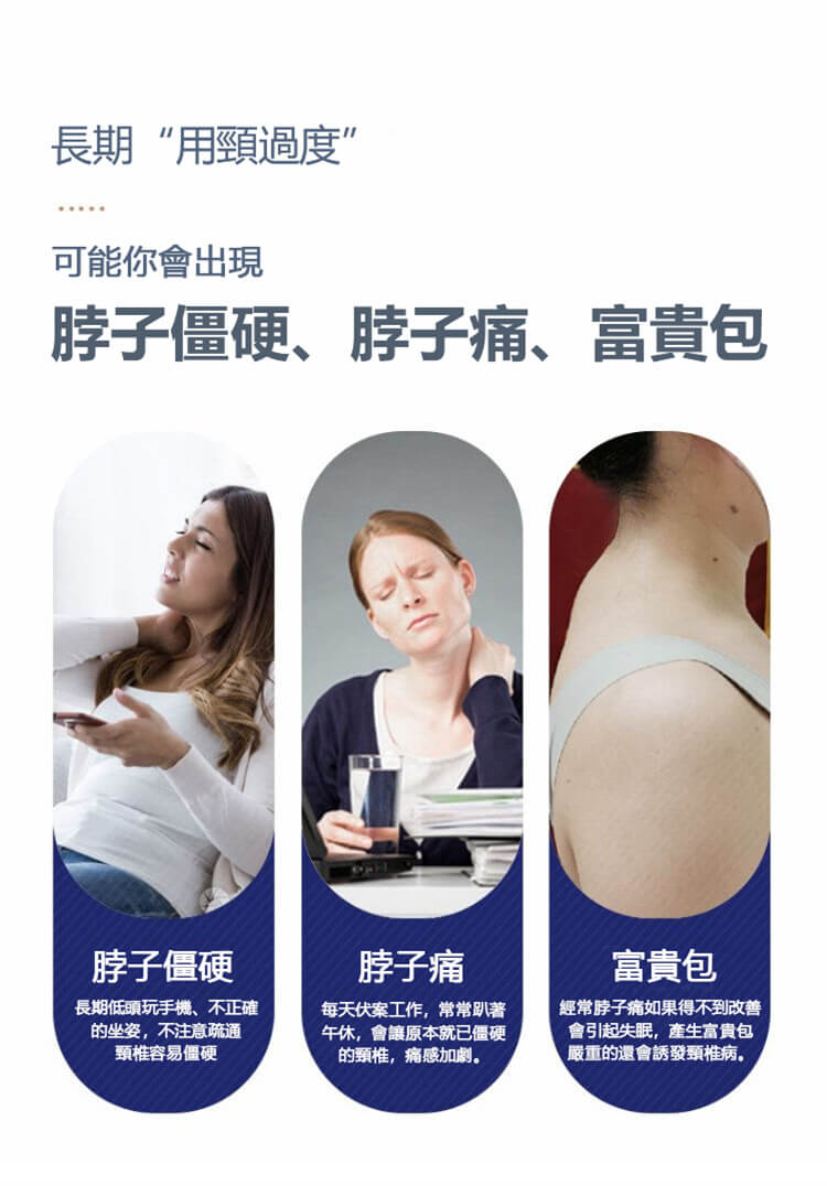 • 功效—按摩、熱敷、牽引;緩解頭暈手麻、舒緩頸椎肌肉疼痛、放鬆頸部、改善富貴包等頸椎問題