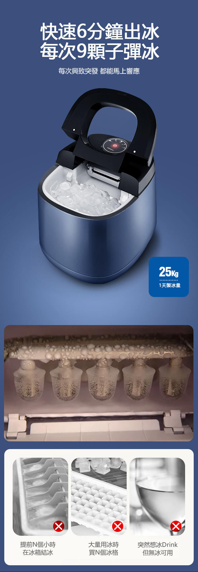 - 產大量冰—每次9顆子彈冰,日產25KG冰量