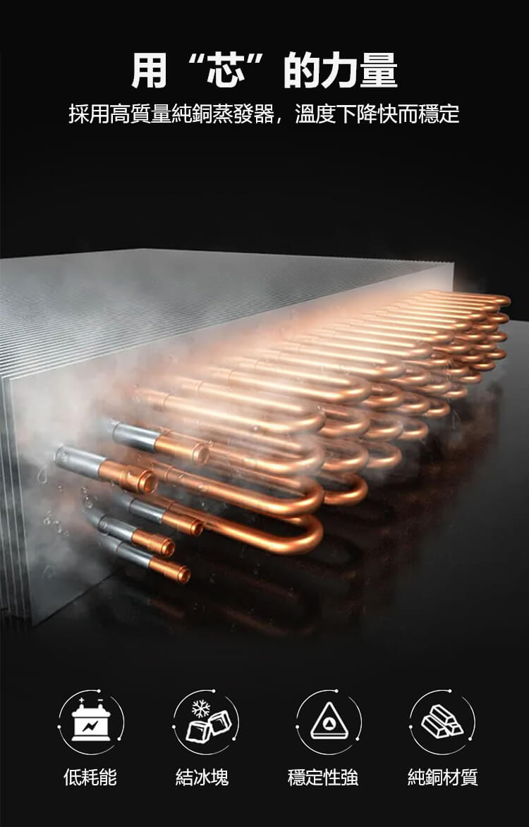 - 高級蒸發器—低耗能、結冰快、穩定性強、純銅材質