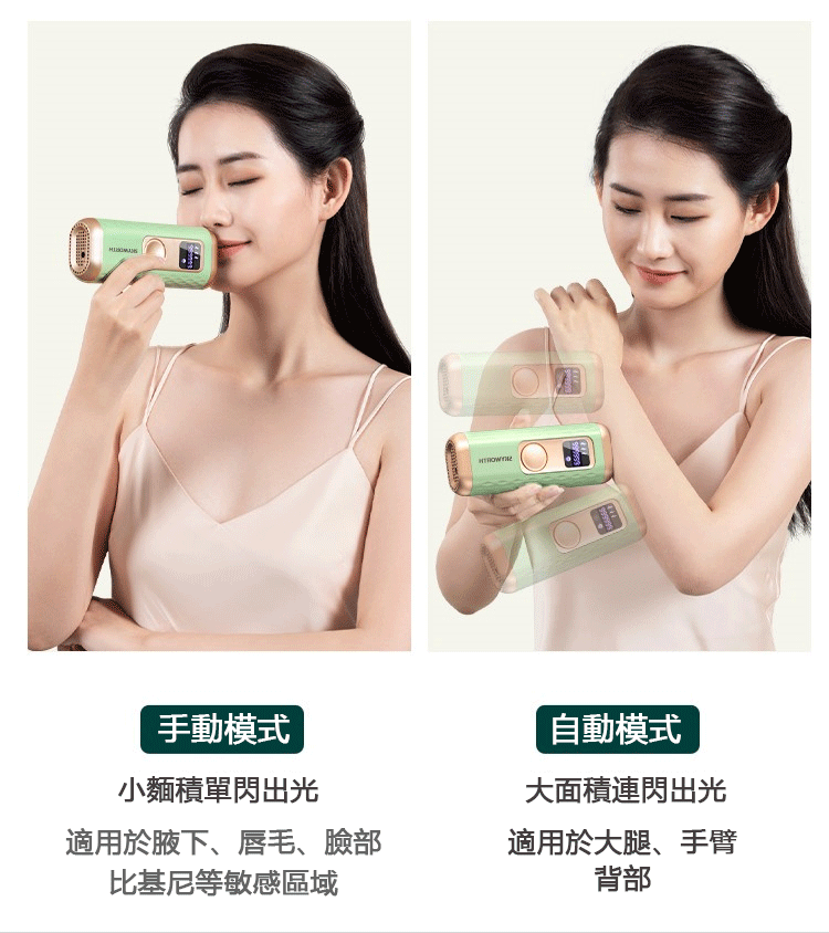 - 適用部位—全身360°無死角脫毛。包扣唇部、腋下、手臂、比基尼線、腿部、臉部